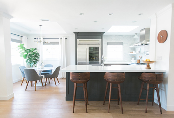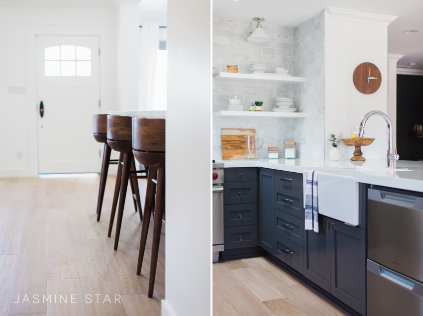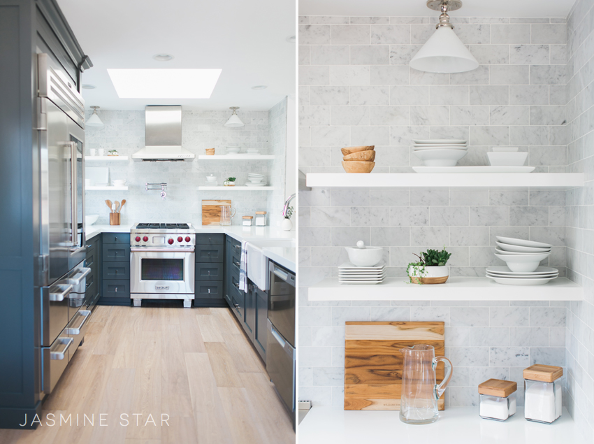 We spend most our time in the kitchen (JD does the cooking, I do the eating), so having a space that's conducive for friends and family to commune while we host has been truly amazing. I'm smitten with the shaker cabinets (we kept the old cabinets in place and a woodworker refaced the doors to save on money) and the open shelving.